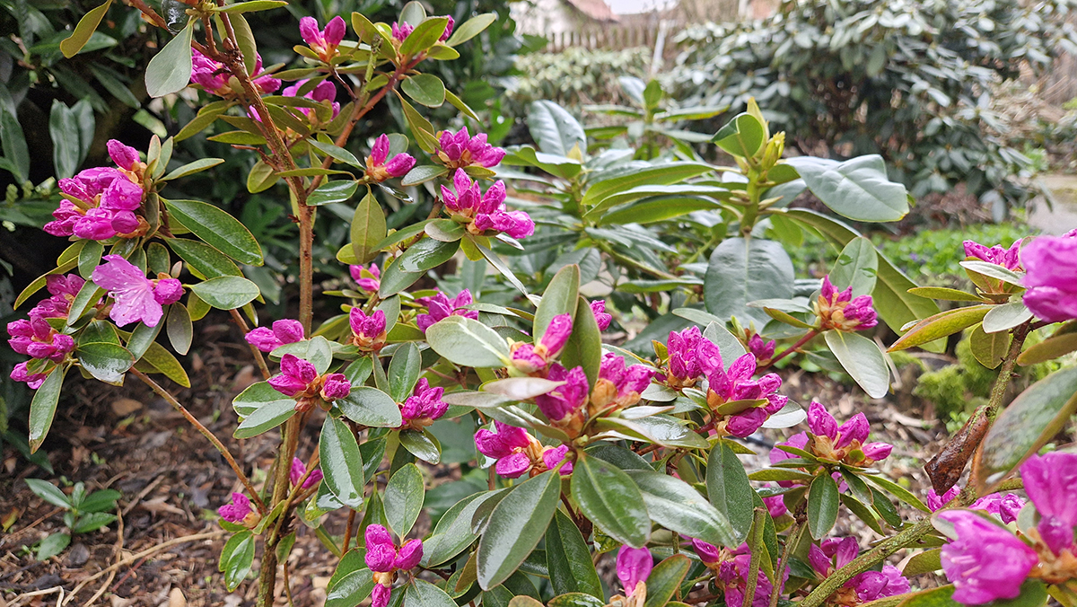 Rhododendron carolinianum P.J.M. Regal blüht bereits Anfang April